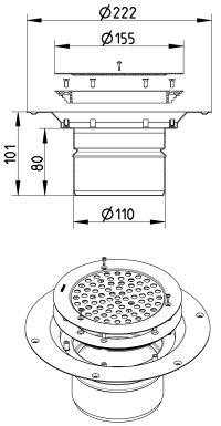 Wpust łazienkowy odpływ pion DN =110 mm, ruszt okrągły, do podłóg winylowych, stal kwasoodporna