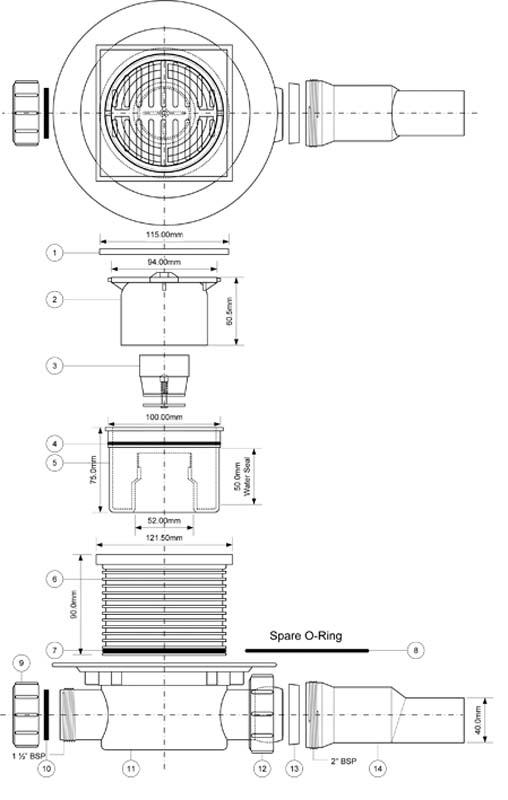 Wpust podłogowy z kwadratową kratką 115x115mm,wykonaną ze stali nierdzewnej. Wyposażony w zawór anty-zapachowy. Wysokość regulowana. Odpływ wody 46 l/min.