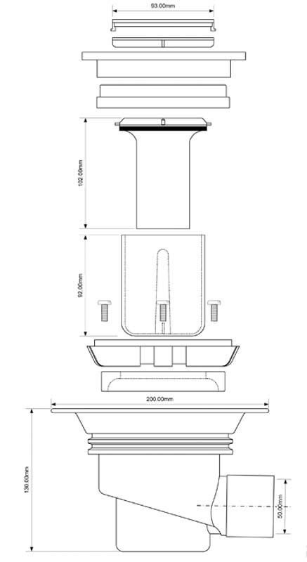 Wpust podłogowy do kabin przysznicowych wykonany z ABS z kwadratową kratką 150x150mm, wykonaną ze stali nierdzewnej. Króciec odpływowy o średnicy 50mm. Wysokość wpustu 130mm. Odpływ wody 46 l/min.