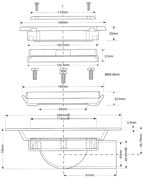 Wpust kwadratowy wykonany z ABS, z kwadratową kratką 150x150mm, wykonaną ze stali nierdzewnej. Krócic odpływowy o średnicy 50mm. Wysokość wpustu 70mm.