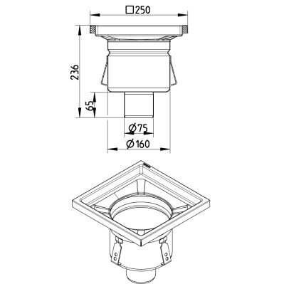 Wpust przemysłowy, kwadratowy 250, odpływ pion DN =75-V, niski model