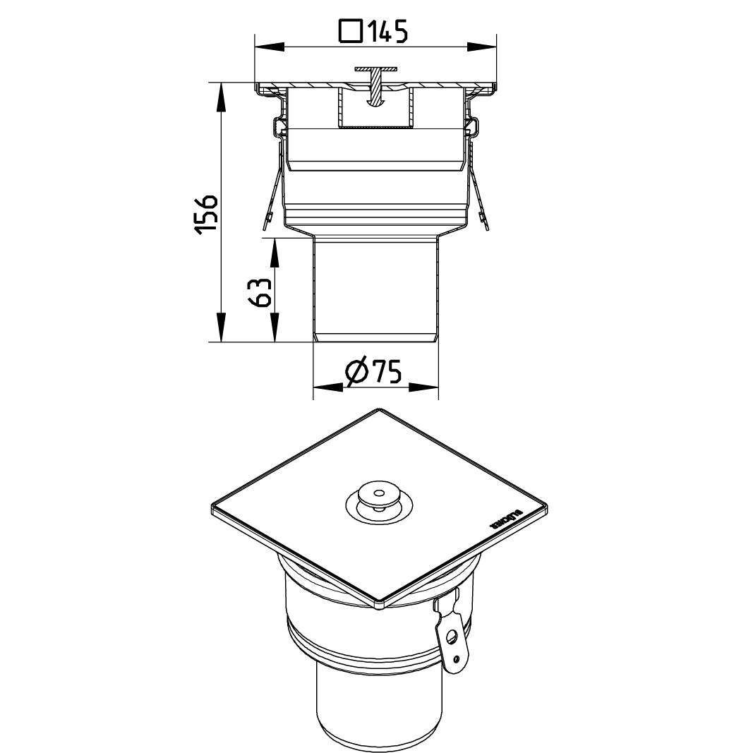 Wpust rewizyjny ruszt 145x145 ruszt kwadratowy, odpływ pion DN =75 mm, otwierany na uchwyt, stal kwasoodporna