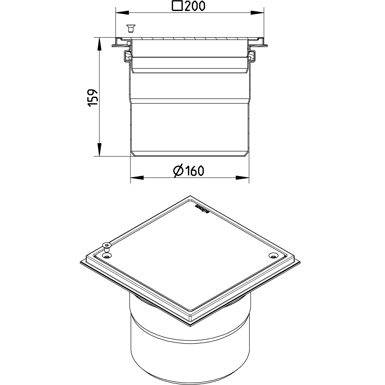Wpust rewizyjny ruszt 3 mm 200x200 kwadratowy, odpływ pion DN 160 mm, przykręcany śrubami