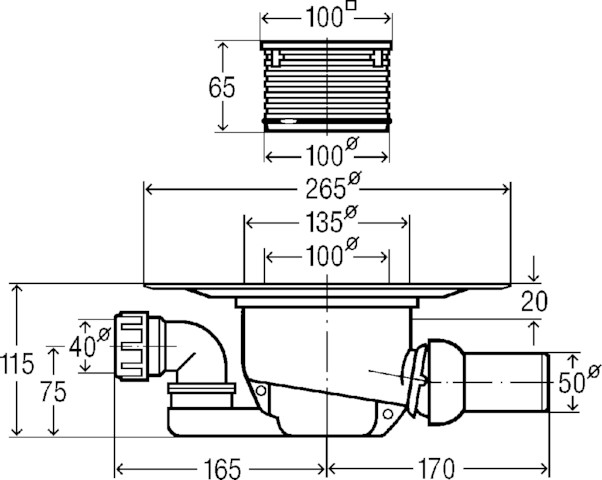Wpust VIEGA 49216 z 1 przyłączem DN 50, odpływ pionowy, kratka 100x100mm stal