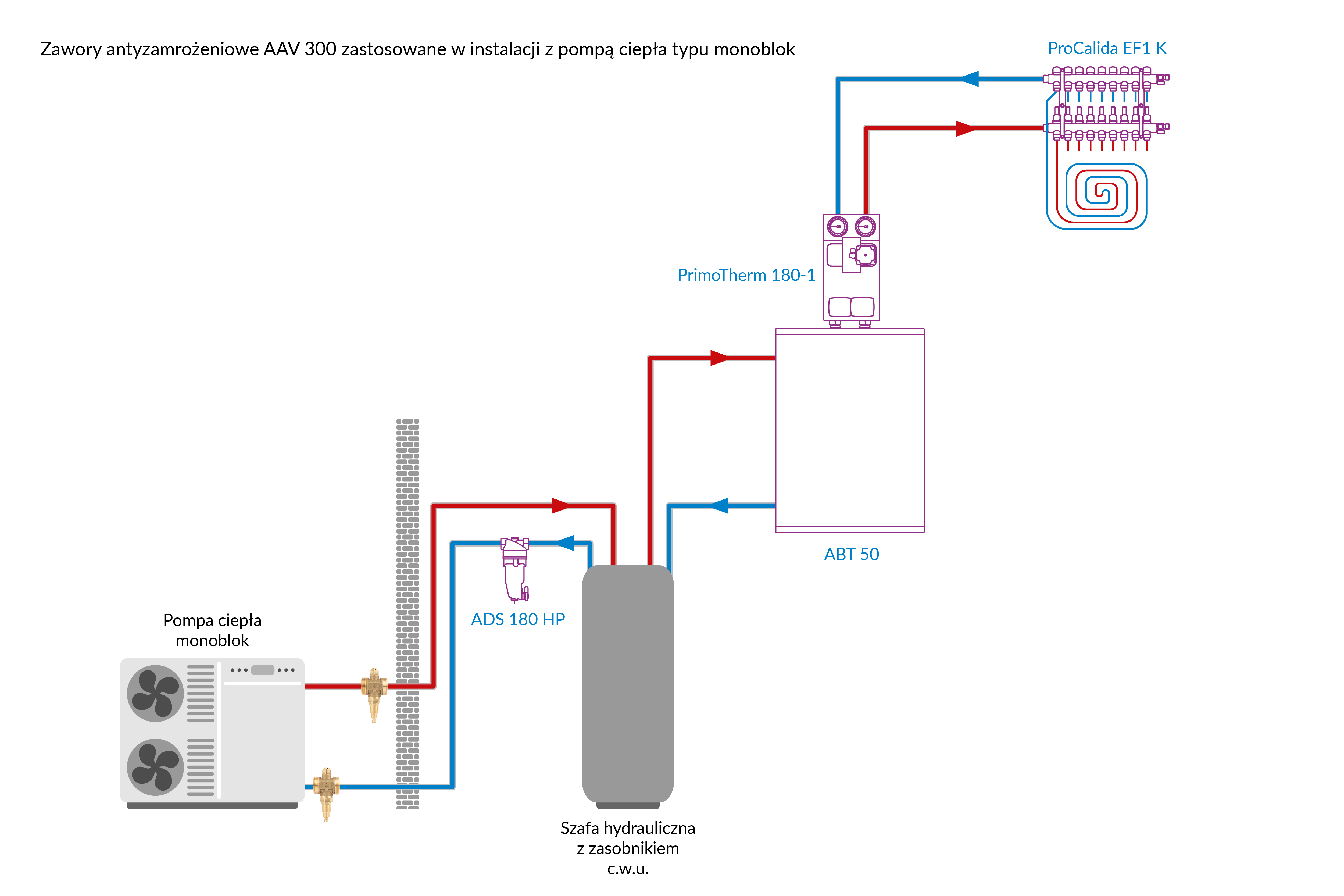 Stosowany w instalacjach grzewczych i chłodzących z powietrzną pompą ciepła typu monoblok.Montowany na rurze powrotnej i zasilającej na zewnątrz budynku, jak najbliżej jednostki zewnętrznej.