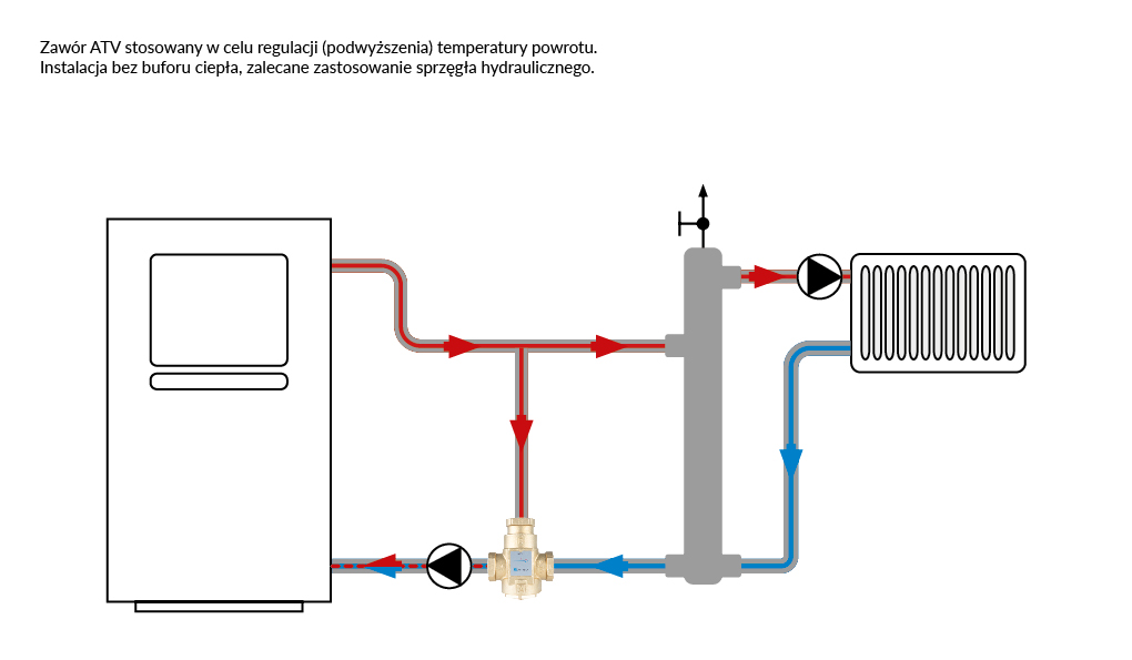 W instalacji z pompą ciepła zawór ATV chroni elementy wewnętrzne przed zbyt wysoką temperaturą medium powracającego do pompy ciepła.