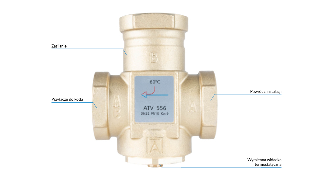 W instalacjach z kotłami stałopalnymi miesza lub rozdziela strumień medium. W przypadku funkcji mieszania ATV zabezpiecza kocioł przed korozją niskotemperaturową na skutek powrotu wody o zbyt niskiej temperaturze. W przypadku funkcji rozdzielania ATV rozdziela medium między powrotem do kotła a zasilaniem instalacji, umożliwiając wygrzanie kotła do odpowiedniej temperatury.