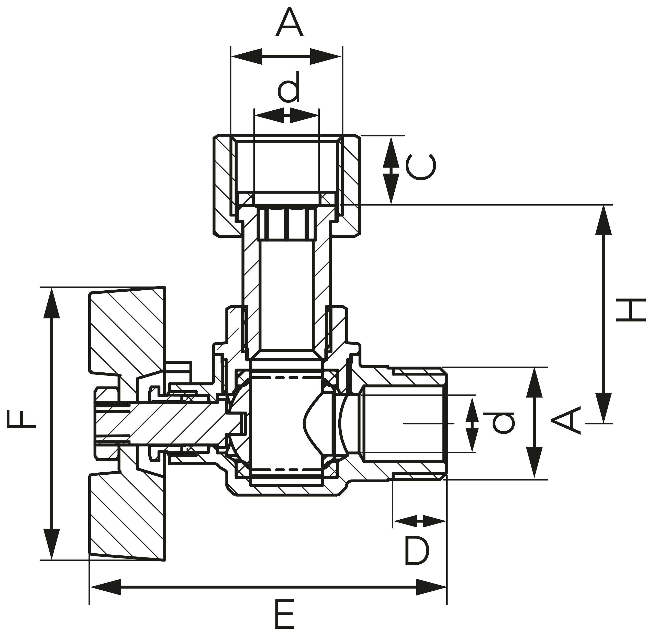 Zawór kątowy z obrotową nakrętką. Uszczelnienie płaskie, uszczelka EPDM. Konstrukcja zaworu umożliwia prosty montaż i demontaż urządzeń. Zawór wykonany jest z wysokogatunkowego mosiądzu CW617N - 4MS. Zastosowanie w instalacjach, gdzie medium to woda lub woda/glikol.