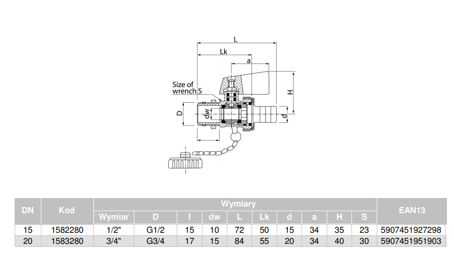 - Zawór wyposażony w złączkę do węża i zaślepkę G3/4"