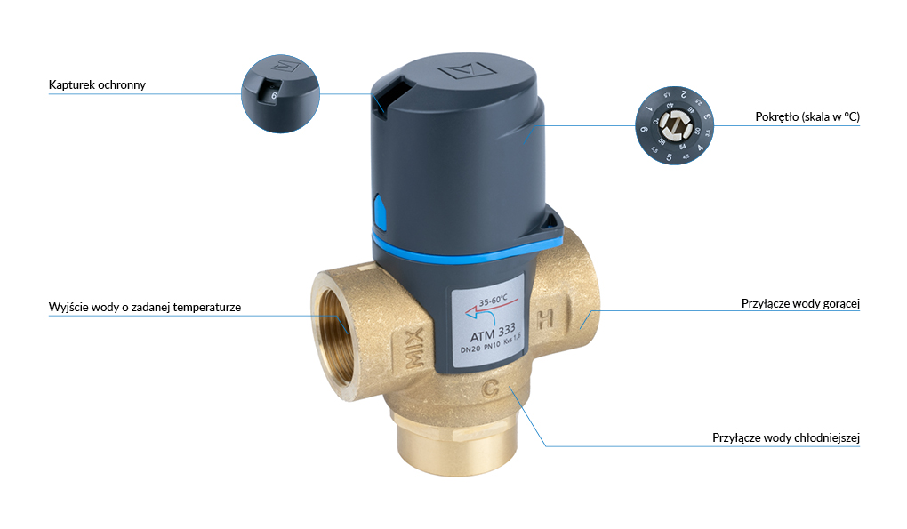 Zawór regulacyjny termostatyczny do wody ciepłej AFRISO ATM 333 mosiądz GW 3/4'', DN 20, zakres temp. 35-60'C, Kvs 1.6 m3/h, maksymalna temperatura 90'C, maksymane ciśnienie 10 bar
