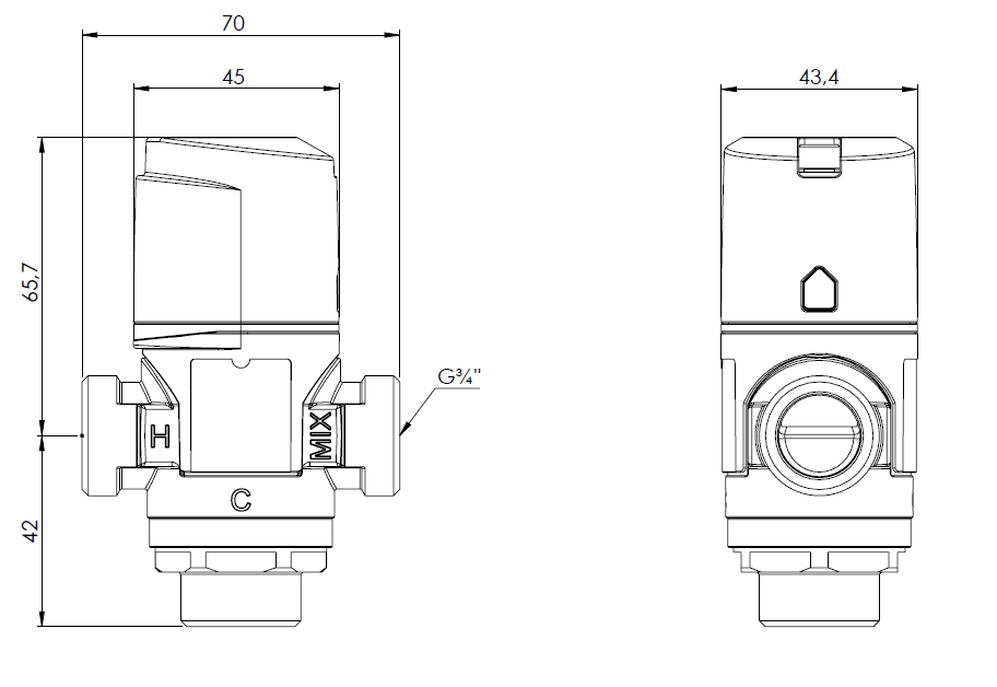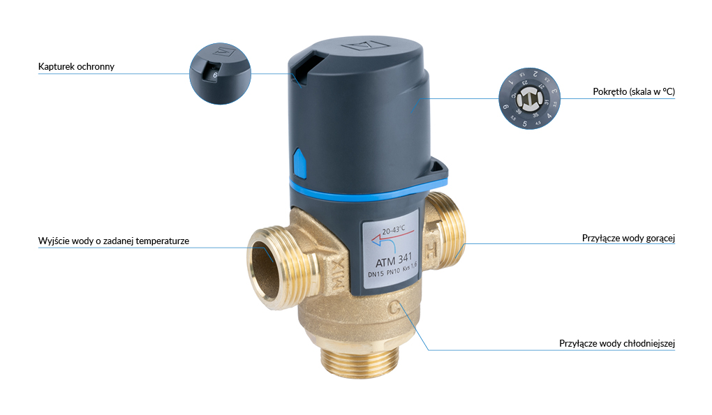 Zawór regulacyjny termostatyczny do wody ciepłej AFRISO ATM 341 mosiądz GZ 3/4'', DN 15, zakres temp. 20-43'C, Kvs 1.6 m3/h, maksymalna temperatura 90'C, maksymane ciśnienie 10 bar