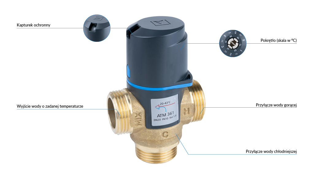 Pod pokrywką chroniącą przed przypadkową zmianą nastawy umieszczono pokrętło do ustawienia temperatury wody zmieszanej.