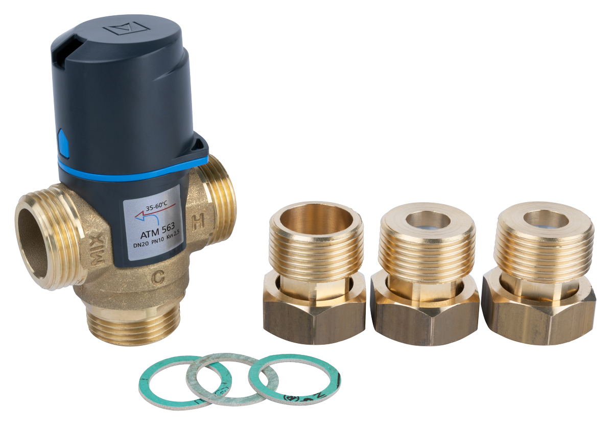 Zawór regulacyjny termostatyczny do wody ciepłej AFRISO ATM 563 ze śrubunkami mosiądz GZ 1'', DN 20, zakres temp. 35-60'C, Kvs 2.5 m3/h, maksymalna temperatura 90'C, maksymane ciśnienie 10 bar