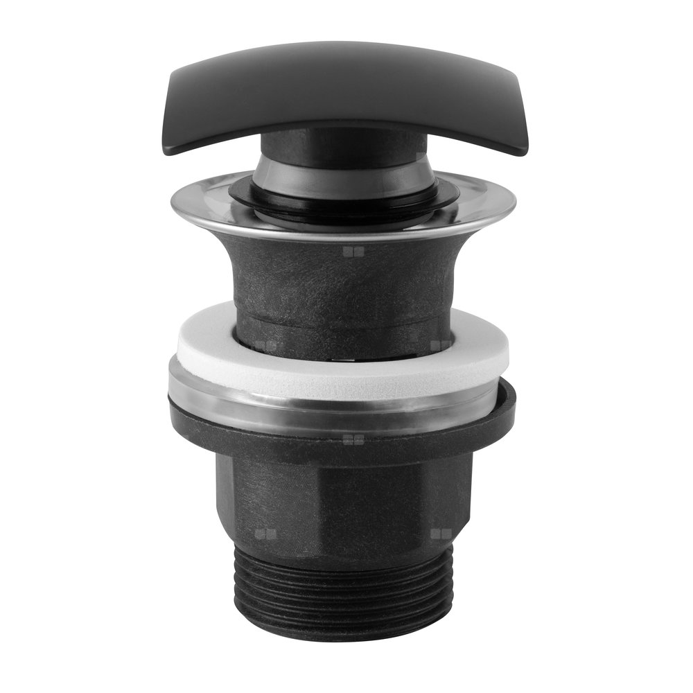 Trwały, czarny korek z korpusem wykonanym z tworzywa, przeznaczony do umywalek z przelewem. Okrągła zaślepka korka wykonana jest z mosiądzu.