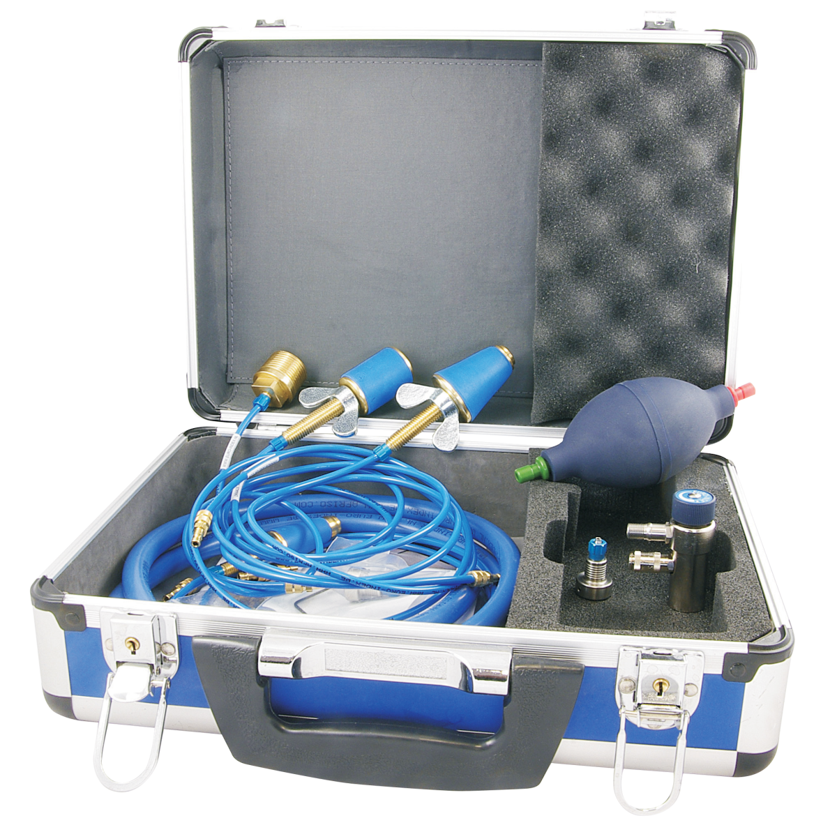 - Wyposażony w aluminiową walizkę, zawór odcinający, pompkę, różnego typu przyłącza do instalacji.