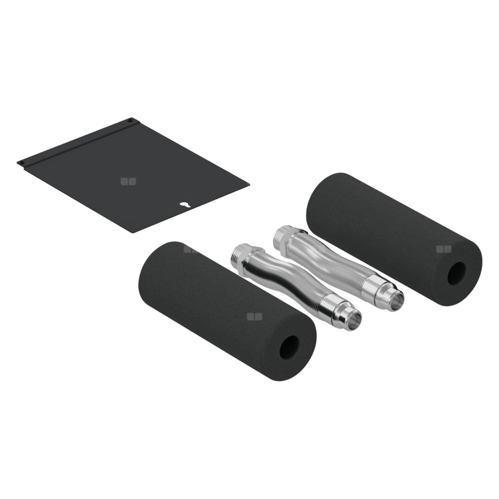 Elastyczne węże (antracytowe) do podłączenia przewodów hydraulicznych w dół wewnątrz pompy ciepła. Węże można wyciągnąć, co umożliwia proste podłączenie do przewodu zasilającego z podłogi. - Zakres dostawy obejmuje dwa węże karbowane z odpowiednią izolacją oraz płytę osłonową do obszaru przyłączeniowego za pompą ciepła.