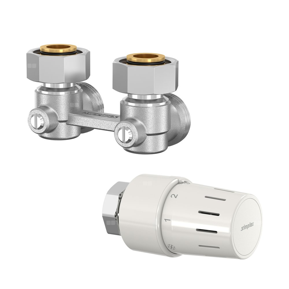 Kompletny zestaw do podłączenia i wyposażenia grzejnika, głowica termostatyczna z przyłączem gwintowanym M 30 x 1,5, podejście kątowe.
