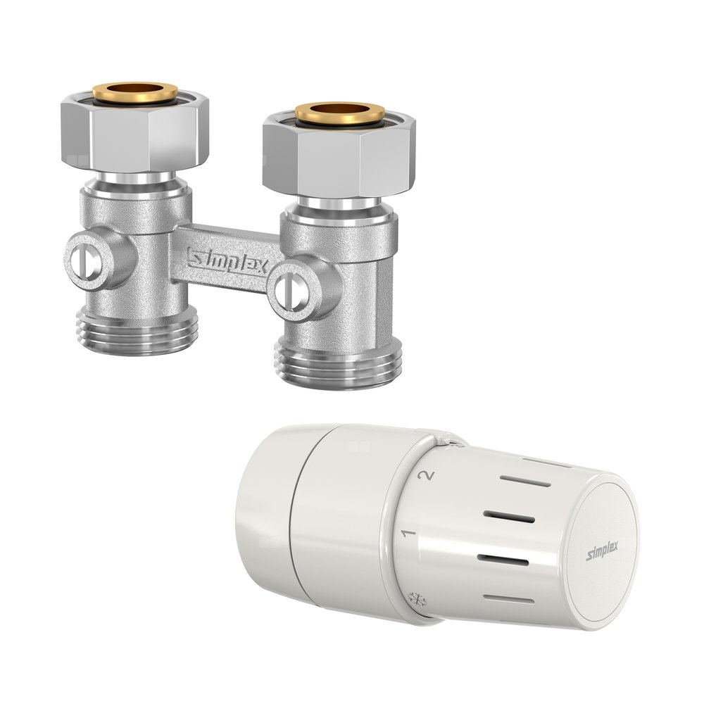 Kompletny zestaw do podłączenia i wyposażenia grzejnika, głowica termostatyczna z przyłączem na zacisk, podejście proste.