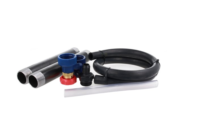 W zestawie: zawór kontrolny z końcówkami do przyłączenia węża, drobne elementy łączeniowe potrzebne do montażu detektora wycieku, 2 metalowe rurki G1" o dł. ok 20 cm (jedna służy do przyłączenia zaworu kontrolnego do zbiornika, druga do przyłączenia węża giętkiego),wąż giętki o dł. ok 80 cm do połączenia zbiornika z pojemnikiem na ciecz detekcyjną,zawór kontrolny, elementy przyłączeniowe do węża x 2, zaciski oraz uszczelki,