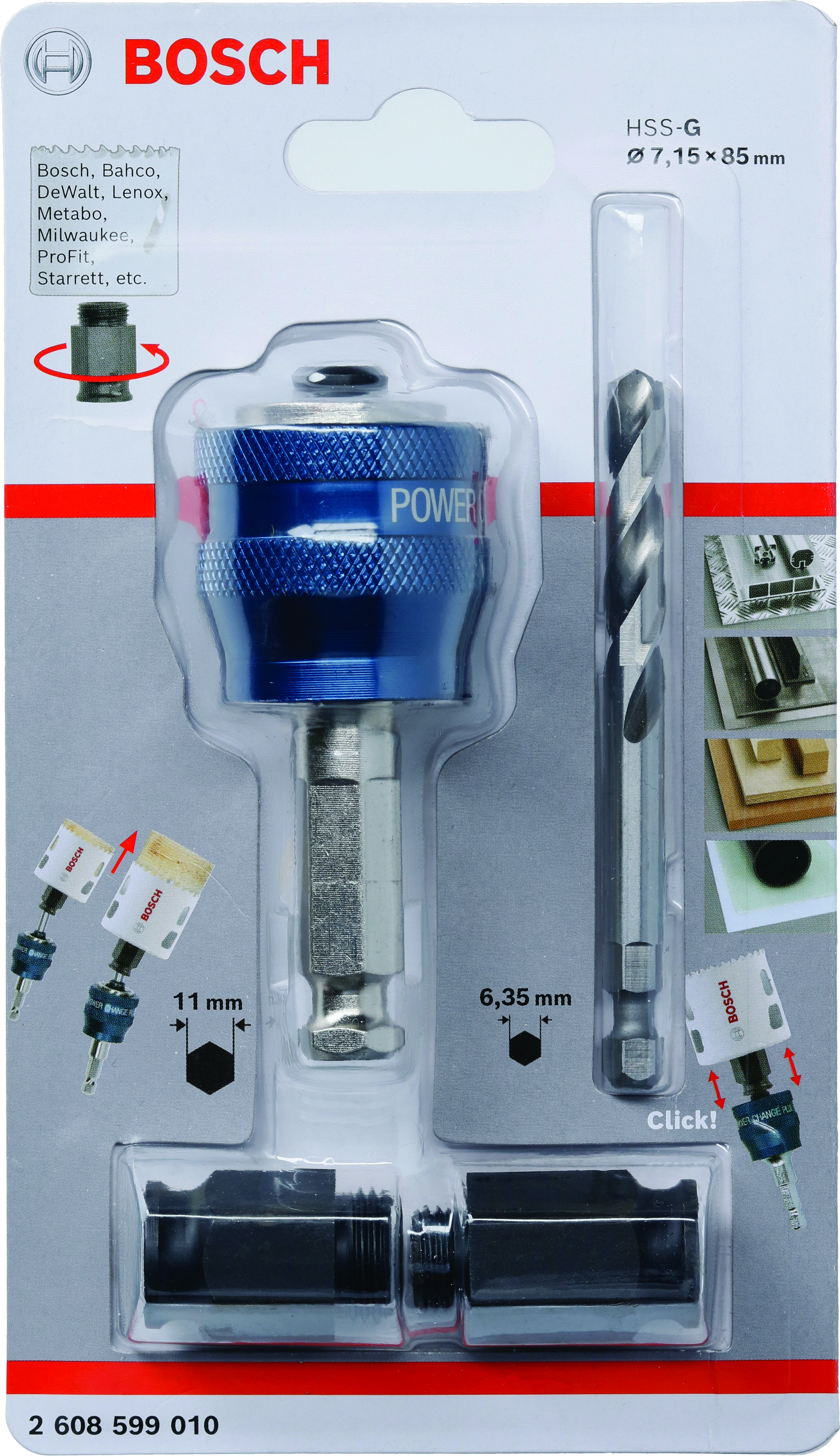 z uchwytem sześciokątnym 9,5 mm. Do pił otwornic o średnicy 14-210 mm. Bez wiertła centrującego.