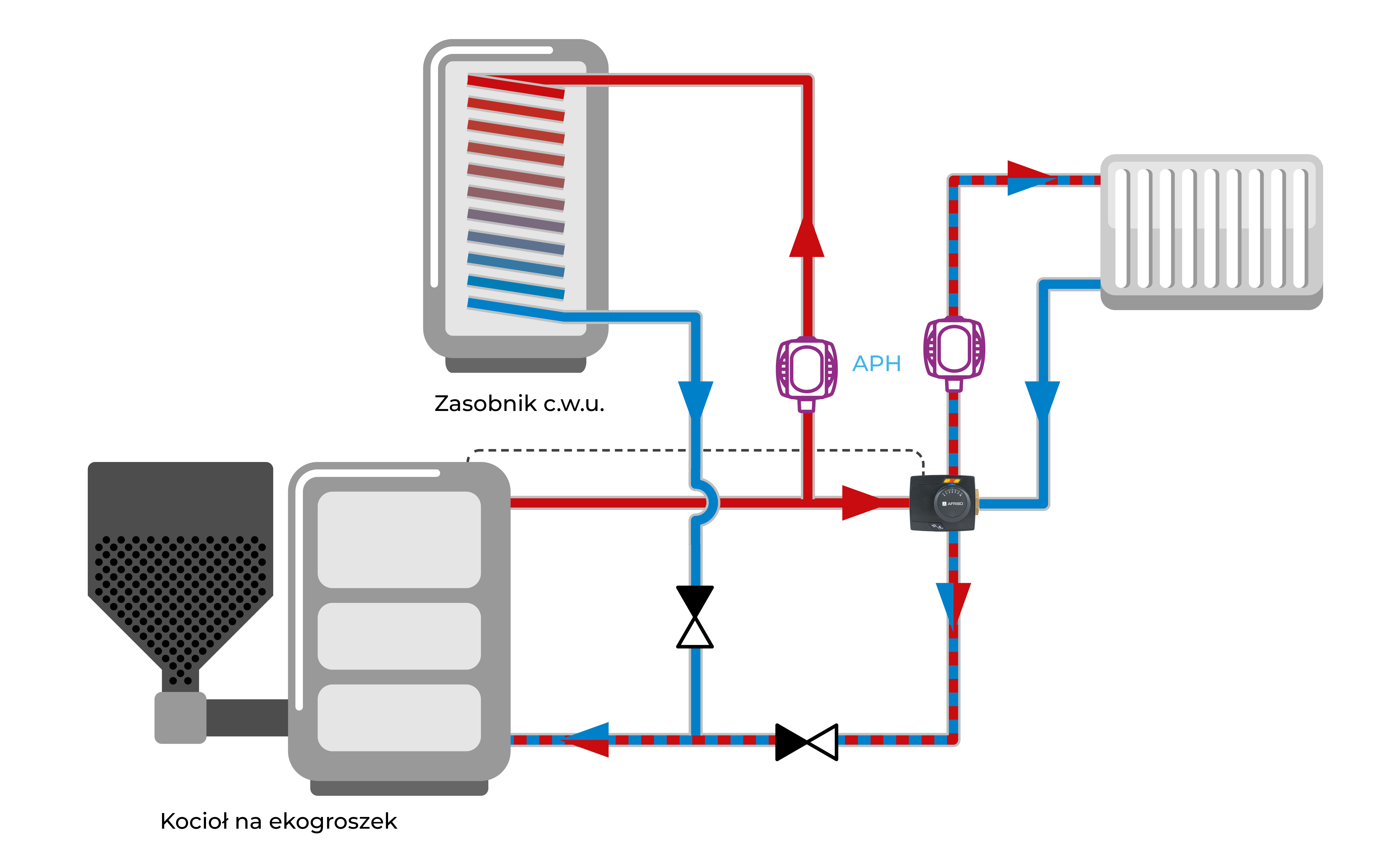 Stosowany w instalacjach grzewczych z kotłami na paliwa stałe, w celu podnoszenia temperatury powrotu do kotła.Montowany na zasilaniu instalacji jako zawór z podwójnym mieszaniem.