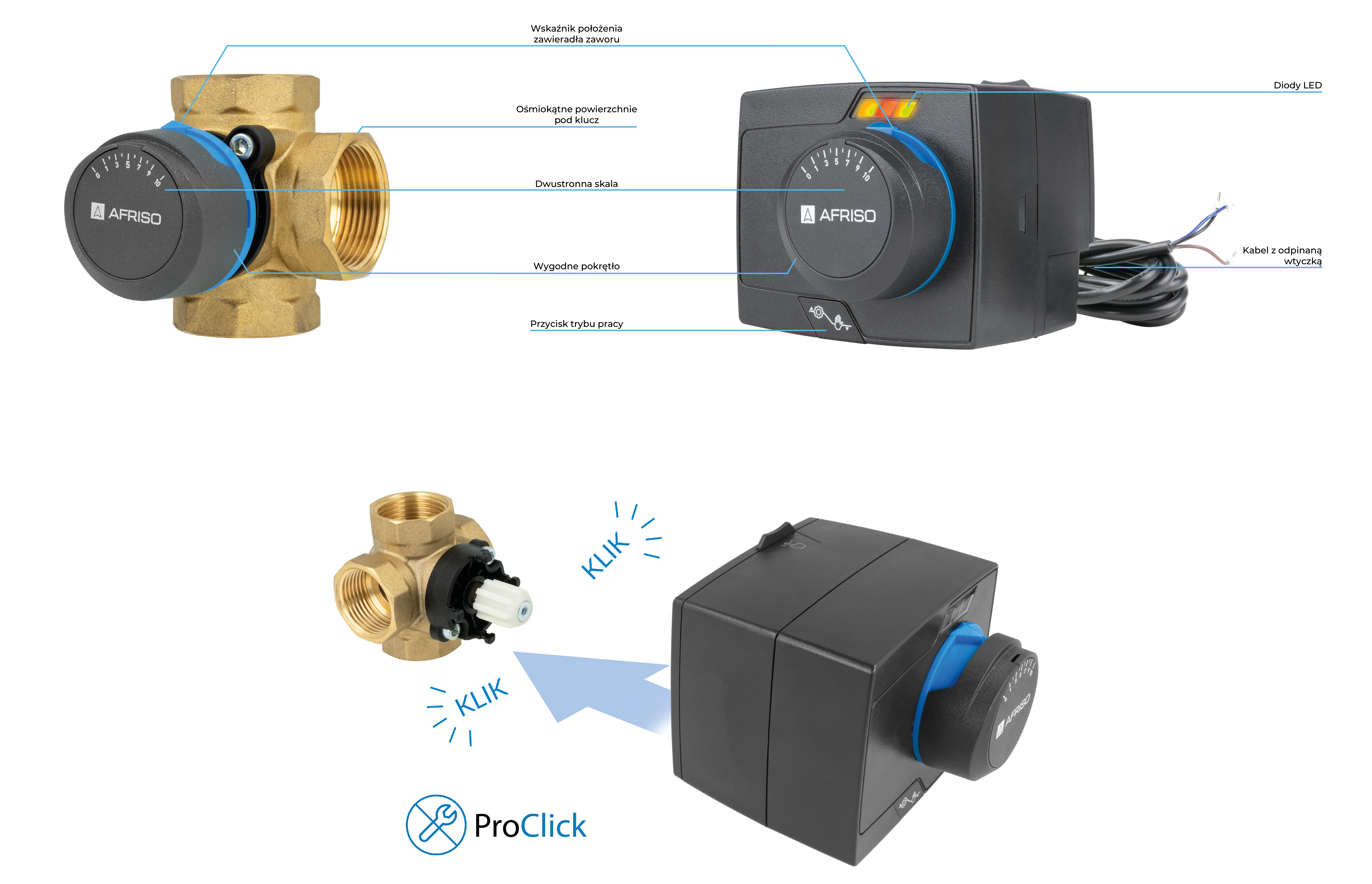 Urządzenia wyposażone w system ProClick – pozwala na bezpośredni montaż siłownika na zaworze bez użycia dodatkowych narzędzi.