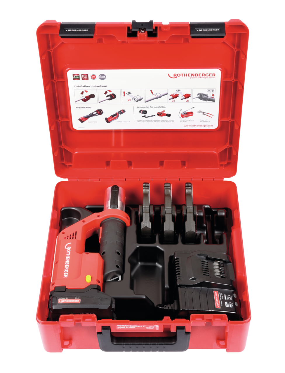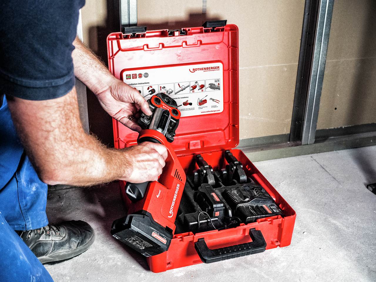 Platforma akumulatorowa ROTHENBERGER umożliwia korzystanie z prasy i wkrętarki akumulatorowej z tym samym akumulatorem