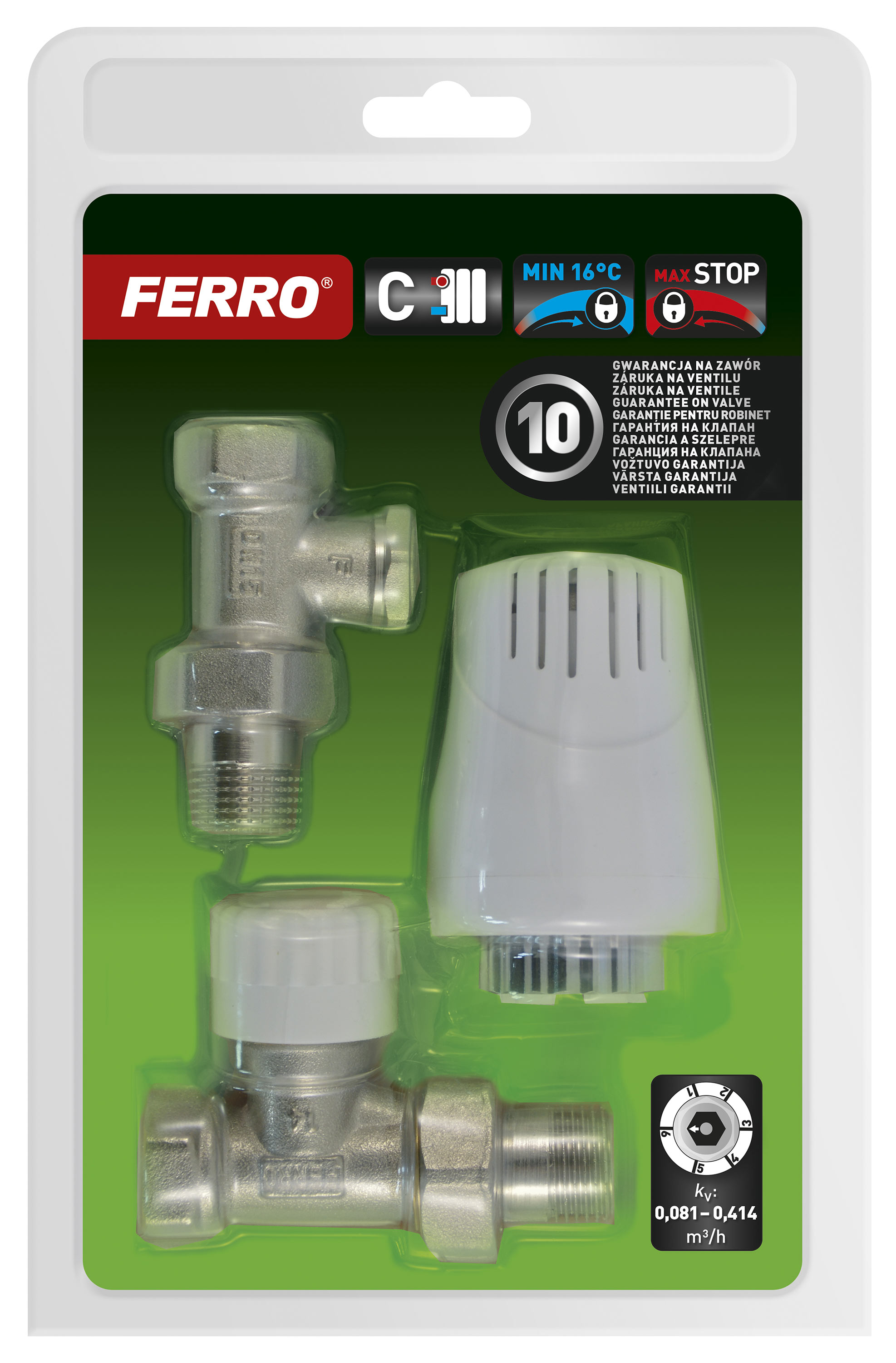 Zestaw termostatyczny prosty 1/2” z zaworem z nastawą wstępną i głowicą z ograniczeniem od 16 st.C