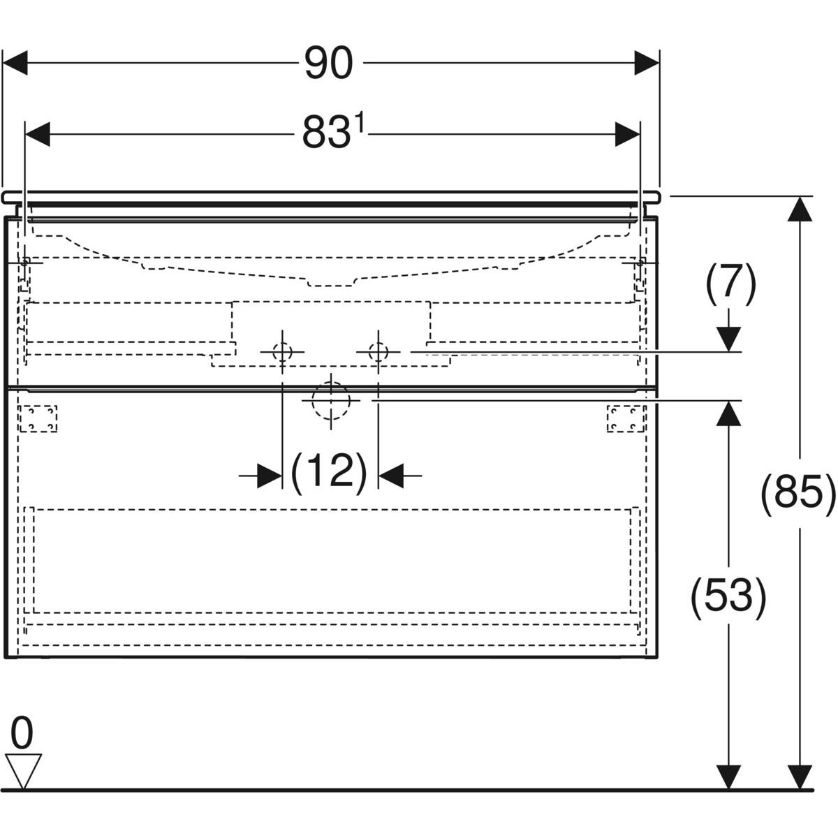 Zestaw umywalki meblowej Geberit iCon slim rim, z szafką pod umywalkę, z dwoma szufladami i zestawem odpływowo-przelewowym do umywalki: B=90cm, Umywalka: biały, Korpus i front: orzech hickory / melaminowa struktura drewna, Uchwyt: lava / malowany proszkowo, matowy