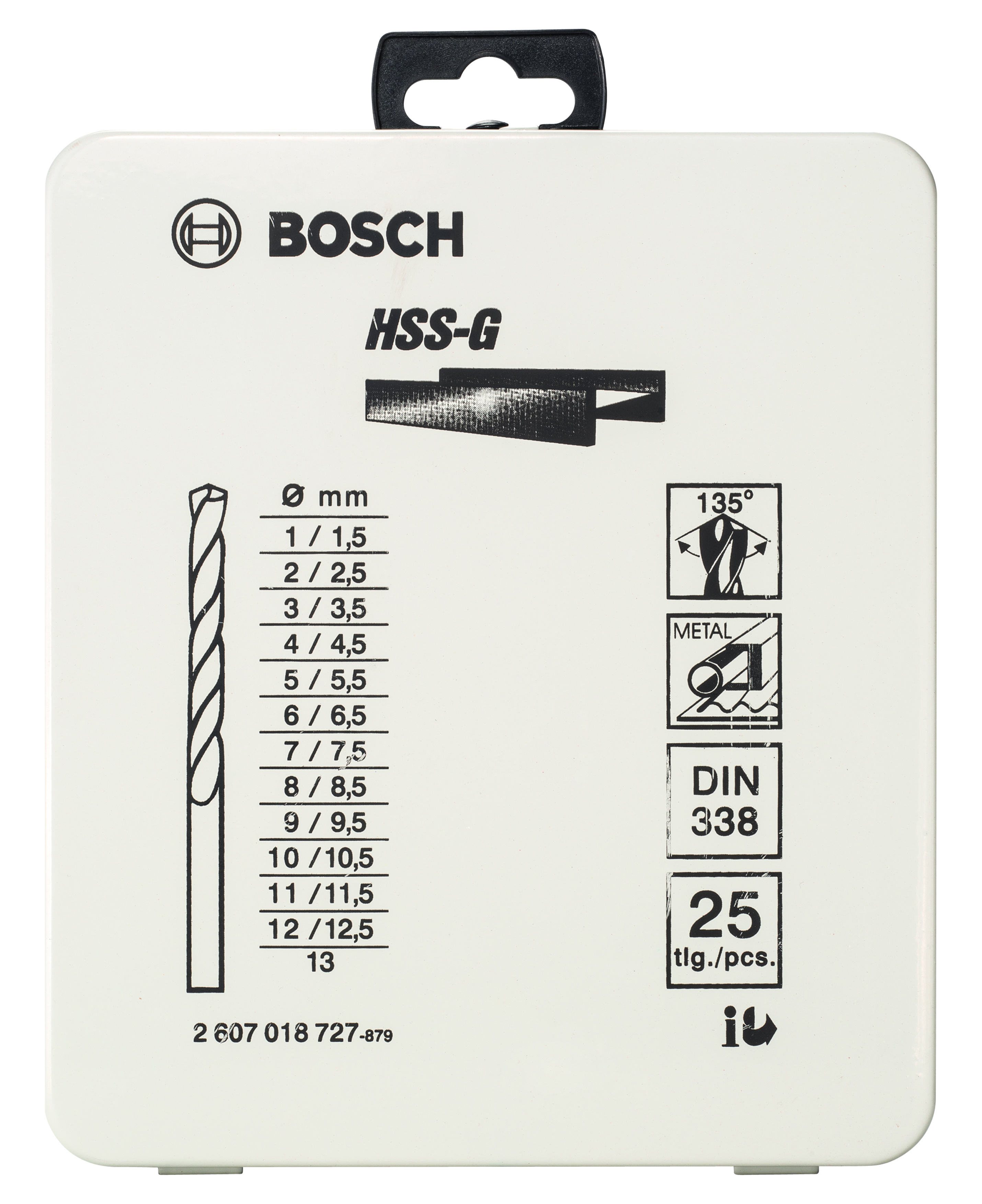 Opis zestawu 25-elem. zestaw wierteł do metalu HSS-G, DIN 338, 135° w metalowej kasecie Średnice (mm): 1; 1,5; 2; 2,5; 3; 3,5; 4; 4,5; 5; 5,5; 6; 6,5; 7; 7,5; 8; 8,5; 9; 9,5; 10; 10,5; 11; 11,5; 12; 12,5; 13 Długości robocze (mm): 12; 18; 24; 30; 33; 39; 43; 47; 52; 57; 57; 63; 69; 69; 75; 75; 81; 81; 87; 87; 94; 94; 101; 101; 101