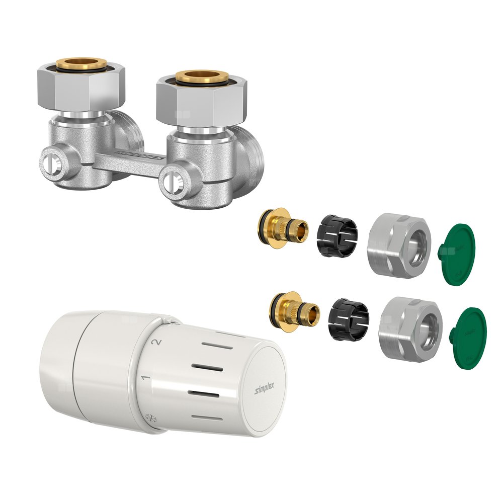 Kompletny zestaw do podłączenia i wyposażenia grzejnika, głowica termostatyczna z przyłączem na zacisk, podejście kątowe.