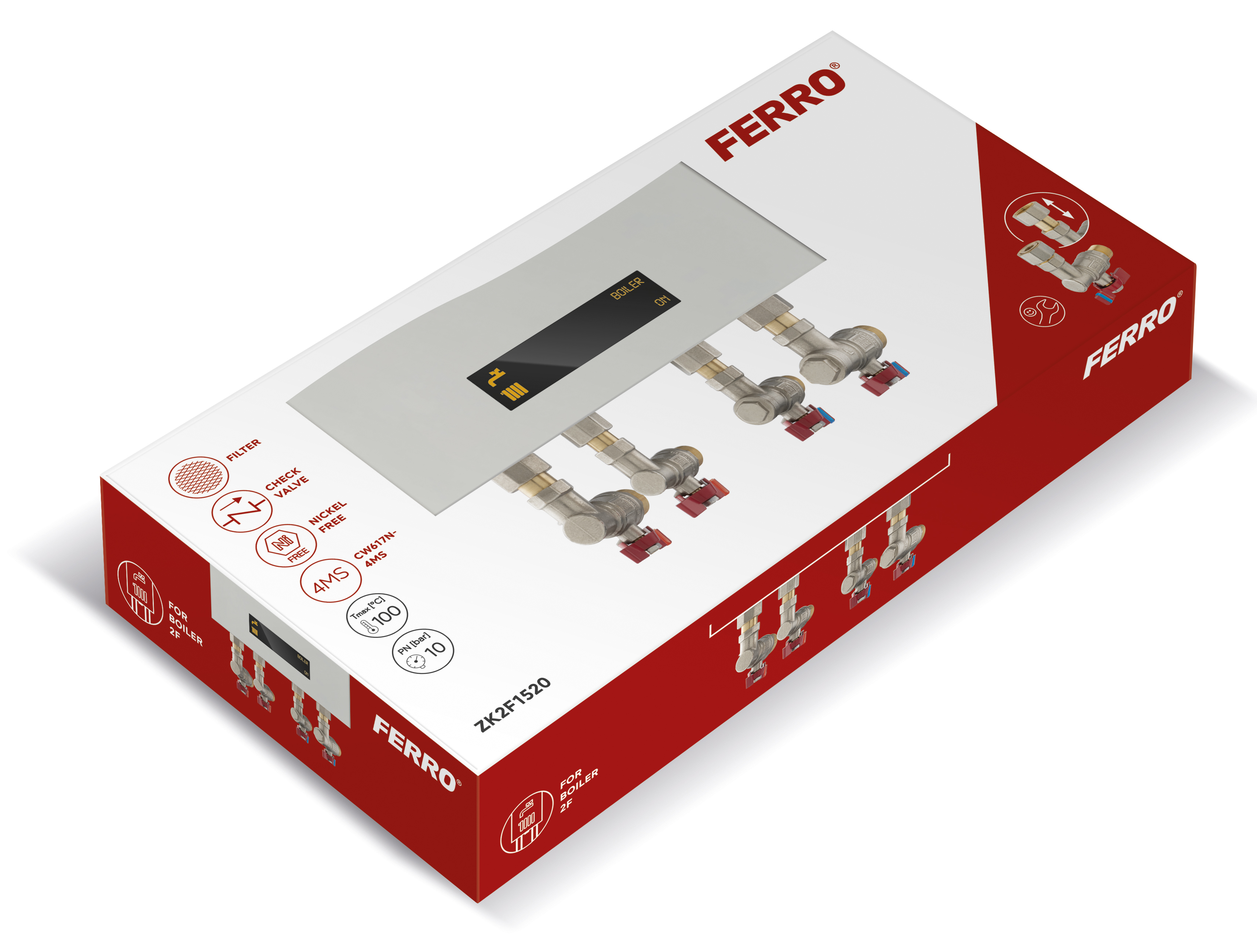 Zestaw zaworów kulowych kątowych z obrotową nakrętką. Zawory dedykowane są pod kotły grzewcze dwufunkcyjne. Zestaw zawiera zawór z filtrem ze stali nierdzewnej AISI304 oraz zaworem zwrotnym oraz zawór kątowy kulowy z uchwytem w postaci motyla pod korpusem zaworu, zawór z filtrem o średnicy DN15 oraz zawory kulowe kątowe DN15 i DN20