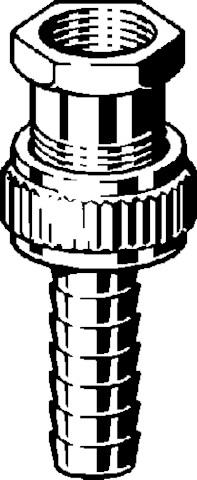 Złączka do rury stojakowej, mosiądz, gw Rp, uszczelnienie płaskie. Wyposażenie: Radełkowana nakrętka złączkowa, uszczelka płaska EPDM, nr wzoru 1841, nr kat. 119 690, Rp: ½ do średnicy wewnętrznej węża: ½ gwint nakrętki G: ¾