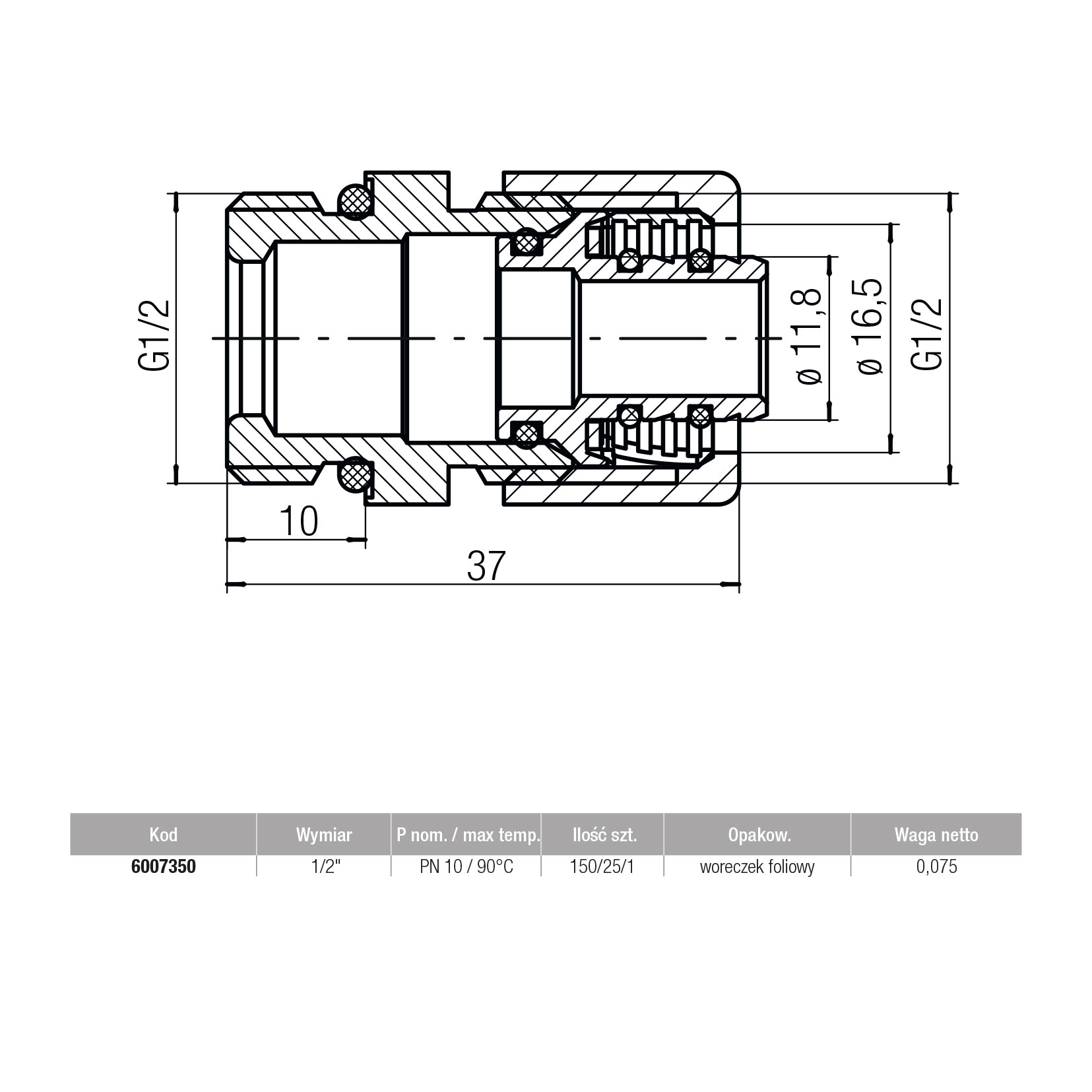 - Złączka 16x2-G1/2 krótka stosowana do rur wielowarstwowych w instalacjach wody zimnej, ciepłej i centralnego ogrzewania