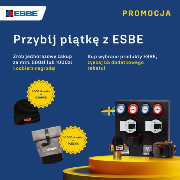 Przy jednorazowym (tj. na jednej fakturze) zakupie za min. 500 zł netto nagrodą jest czapka z logo ESBE, a za min. 1000 zł netto - praktyczny plecak z logo ESBE.